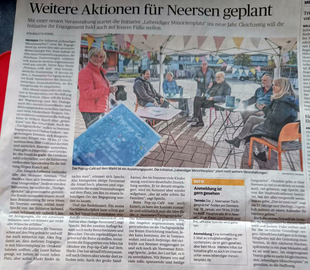 Die Neersener Bürgerinitiative „Lebendiger Minoritenplatz“ hat sich als Ziel gesetzt, den Minoritenplatz in Willich-Neersen als einen lebendigen Ort der Begegnung zu gestalten (wöchentliches Pop-up Café Marktplatz, Neersener Nachbarschaftsfest und Adventssingen unter der Friedenseiche).